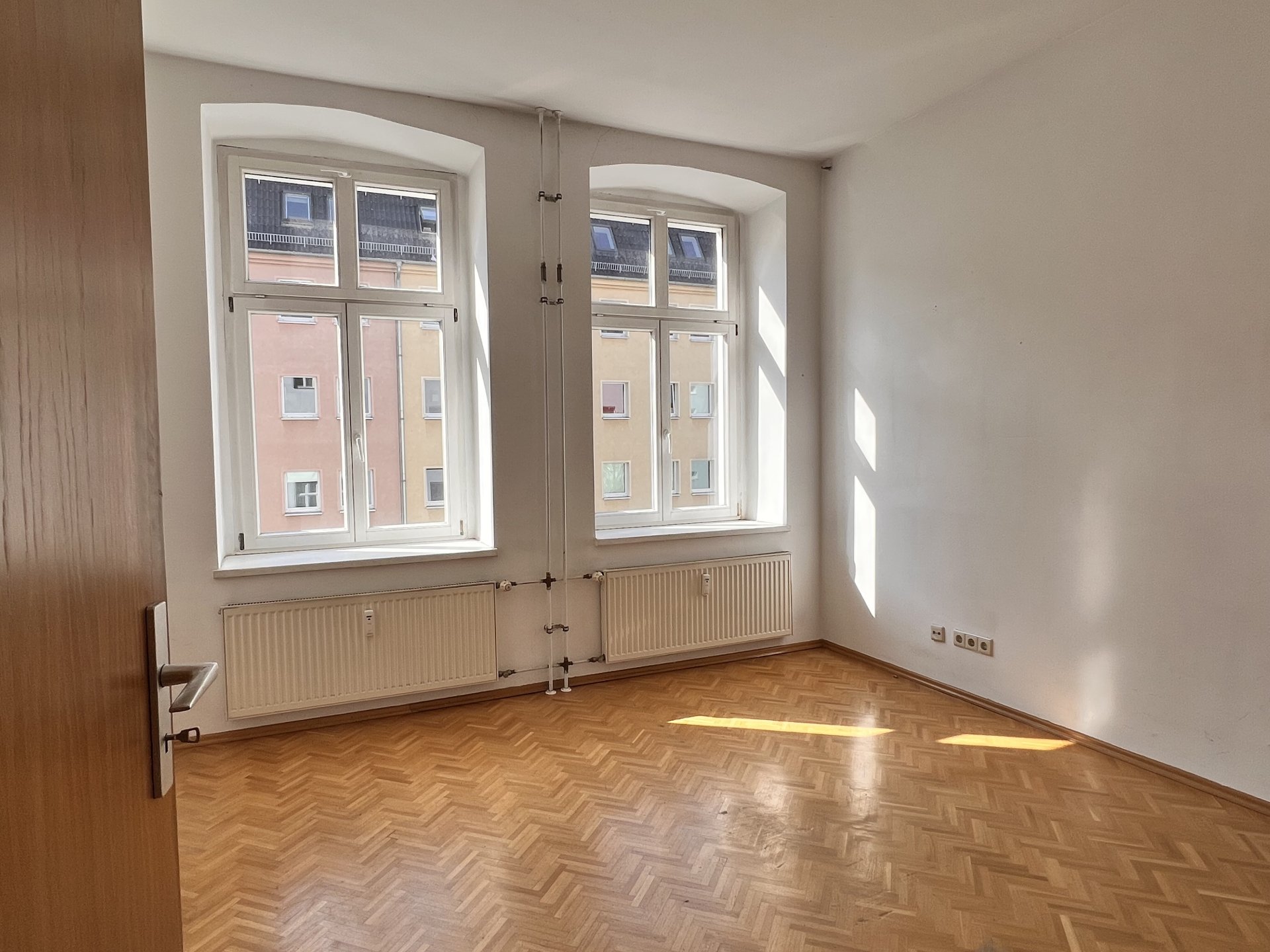 Der Grundriss ist übersichtlich gestaltet: Zwei etwa gleich große, separat begehbare Zimmer gehen von einem zentralen Flur ab, die Küche ist ruhig zum Innenhof ausgerichtet. Bad und WC sind voneinander getrennt und sorgen für zusätzlichen Komfort im Alltag. Ein eigener Kellerraum gehört ebenfalls zur Wohnung.