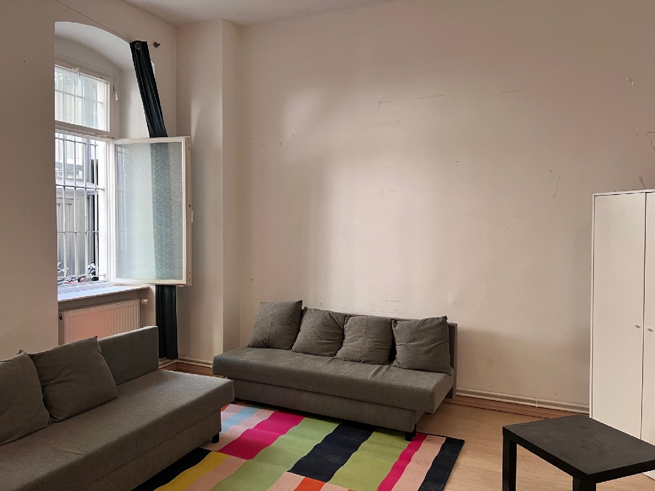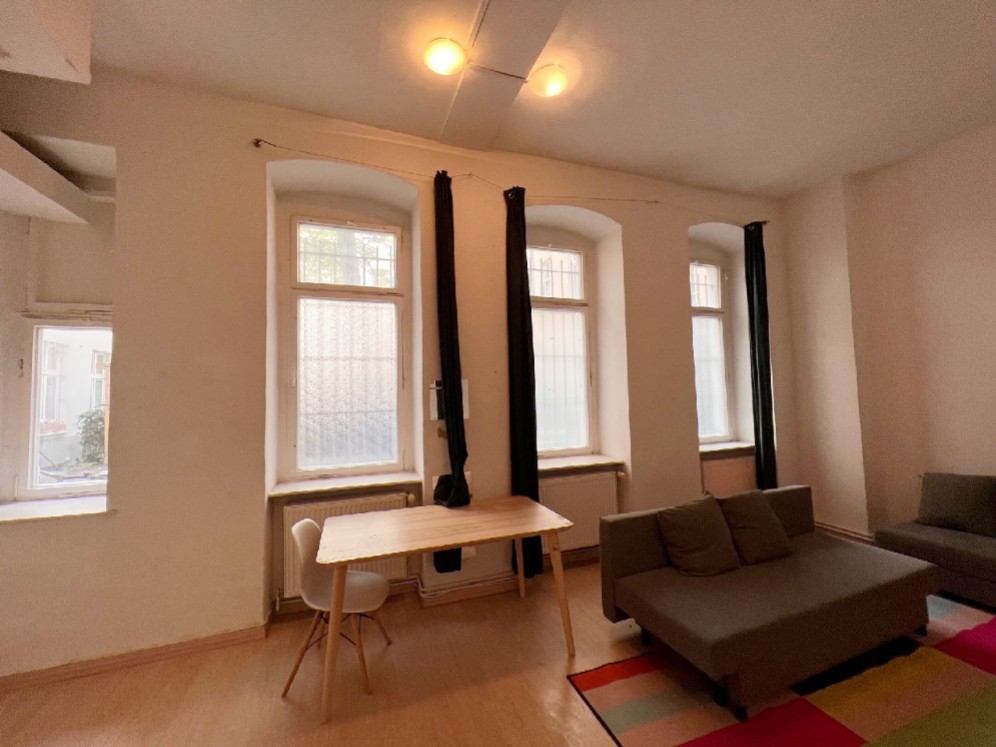 Die modernisierungsbedürftige Wohnung überzeugt durch eine offene Raumgestaltung und hohe Decken von ca. 3,5 Metern. Sie befindet sich im Erdgeschoss des Seitenflügels. Durch die Wohnungseingangstür erschließt sich die komplette Wohnung vom Eingangsbereich aus. 4 große Altbaufenster lassen viel Licht in die Wohnung. Das Badezimmer ist momentan unter der Hochebene integriert, die Küche offen im Wohnbereich. Die Wohnung ist in jedem Fall modernisierungsbedürftig und bietet durch den kompakten Grundriss und die Raumhöhe viel Platz für individuelle Gestaltungswünsche.