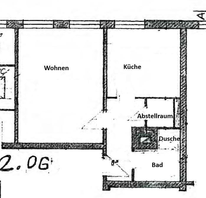 Das Badezimmer ist mit einer Dusche ausgestattet. Die Wohnung ist sanierungsbedürftig und bietet damit ideale Voraussetzungen für Käufer, die ihre eigenen Vorstellungen und Ideen verwirklichen möchten.