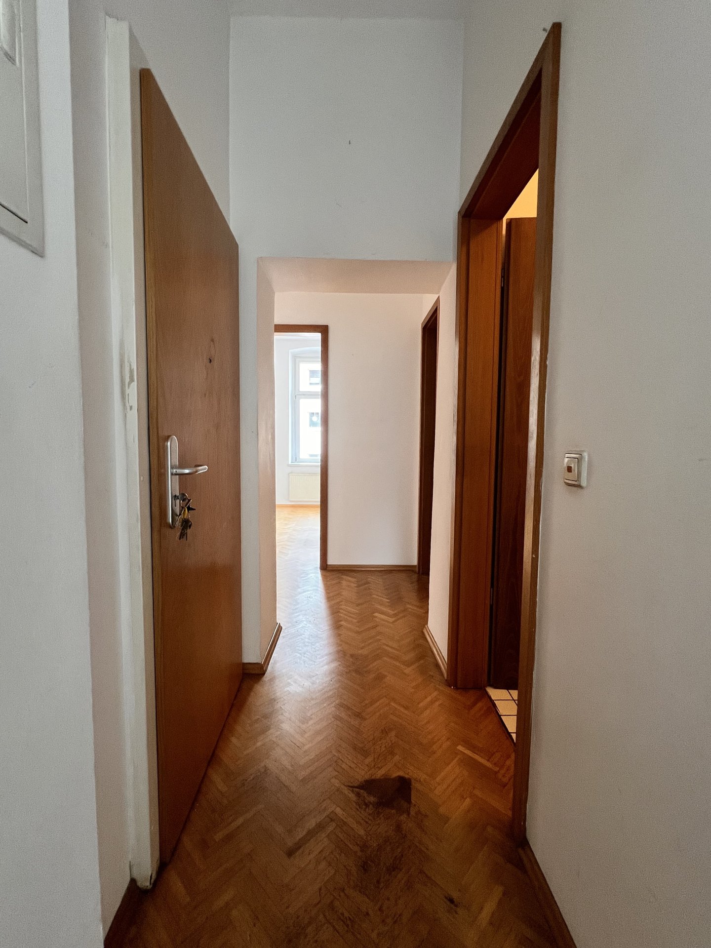 Der Grundriss ist übersichtlich gestaltet: Zwei etwa gleich große, separat begehbare Zimmer gehen von einem zentralen Flur ab, die Küche ist ruhig zum Innenhof ausgerichtet. Bad und WC sind voneinander getrennt und sorgen für zusätzlichen Komfort im Alltag. Ein eigener Kellerraum gehört ebenfalls zur Wohnung.
