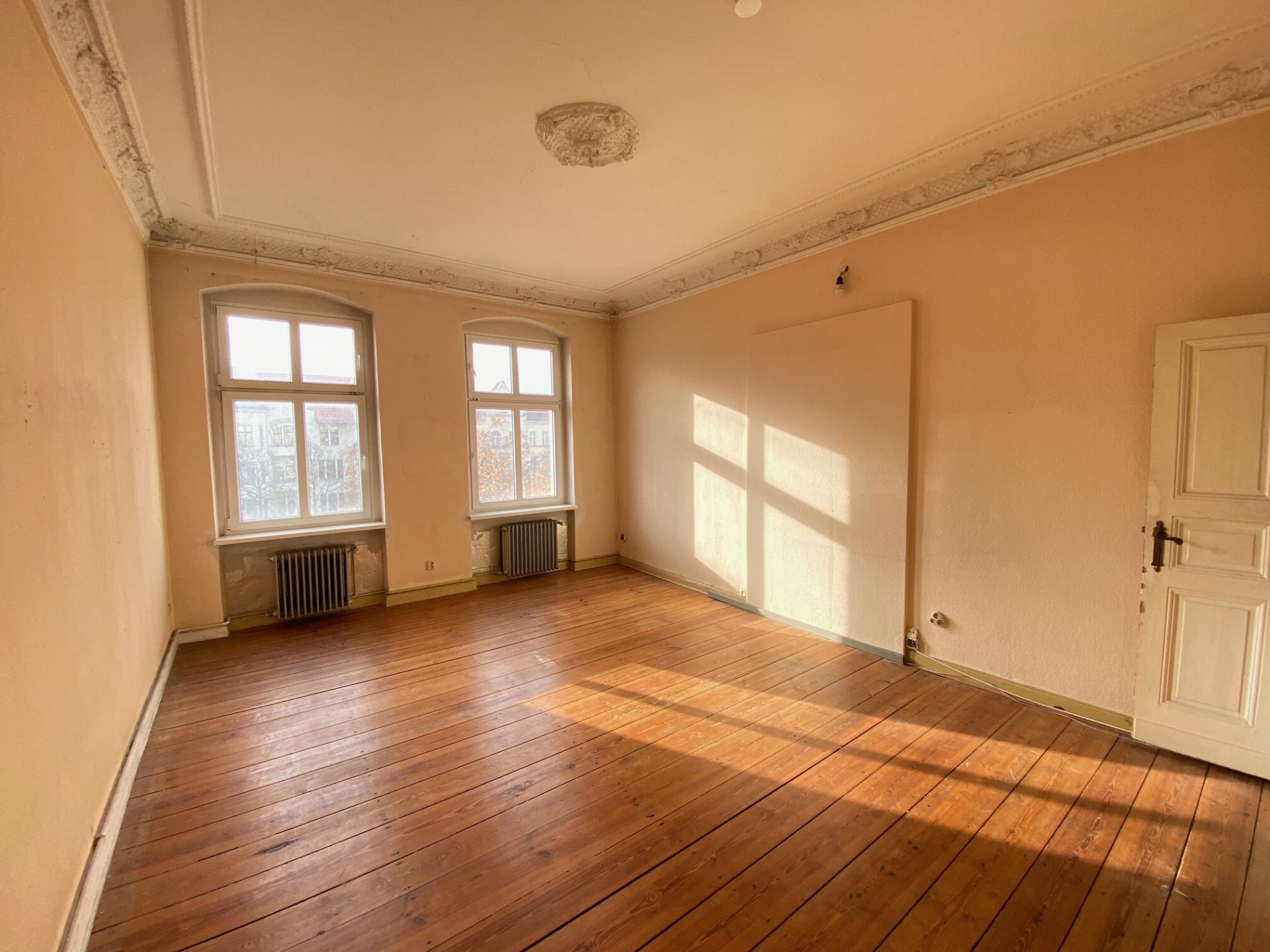 Typische Altbaudetails sind in weiten Teilen erhalten, darunter Stuckdecken, originale Altbautüren sowie ein Dielenboden. Die hohen Decken prägen das Raumgefühl und bieten gute Voraussetzungen für eine individuelle Gestaltung.